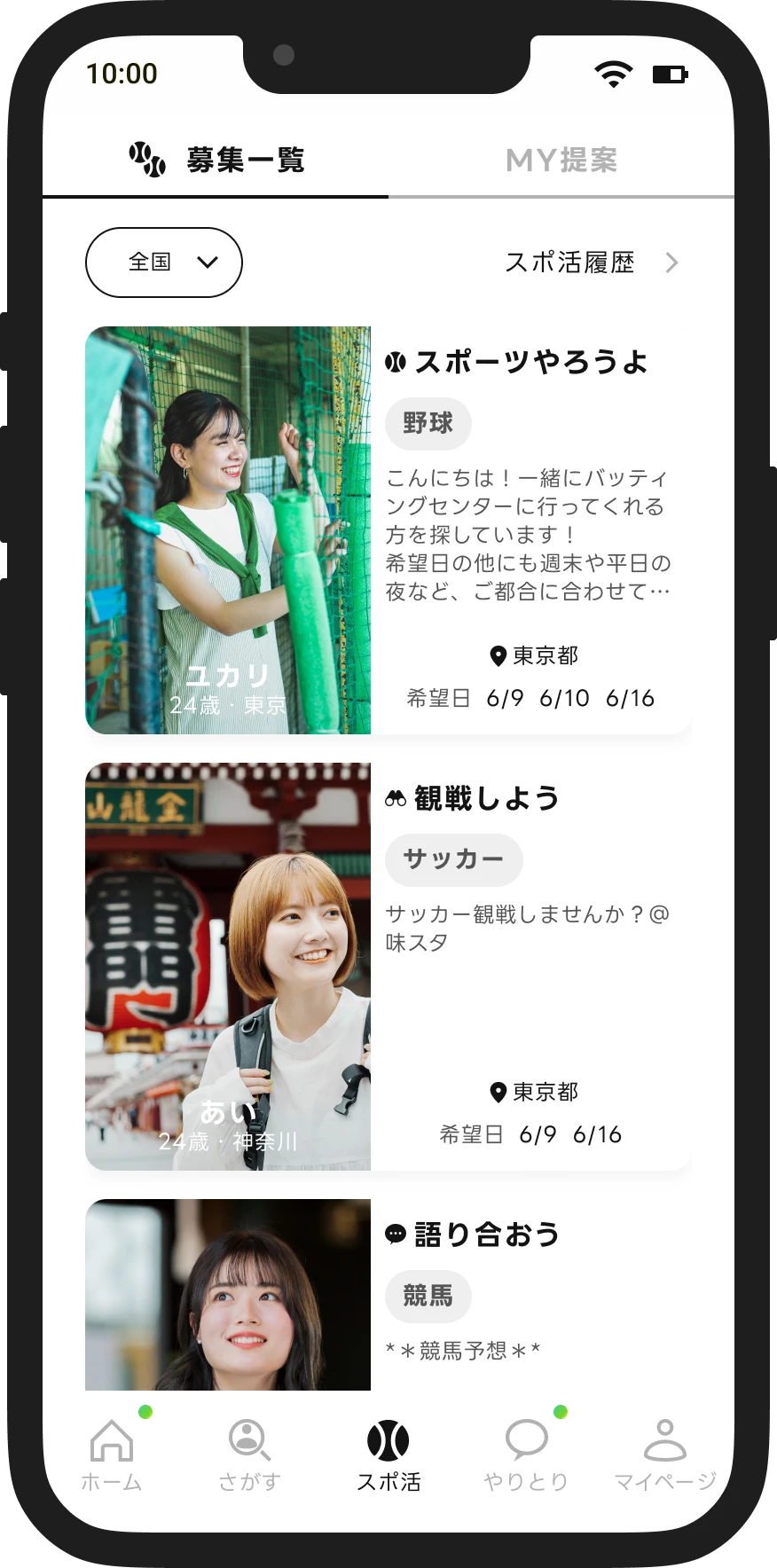 アクティブに出会える観戦やプレイ、スポーツトークなどの「スポ活」プランを立てて、趣味の合うお相手を募集できます。