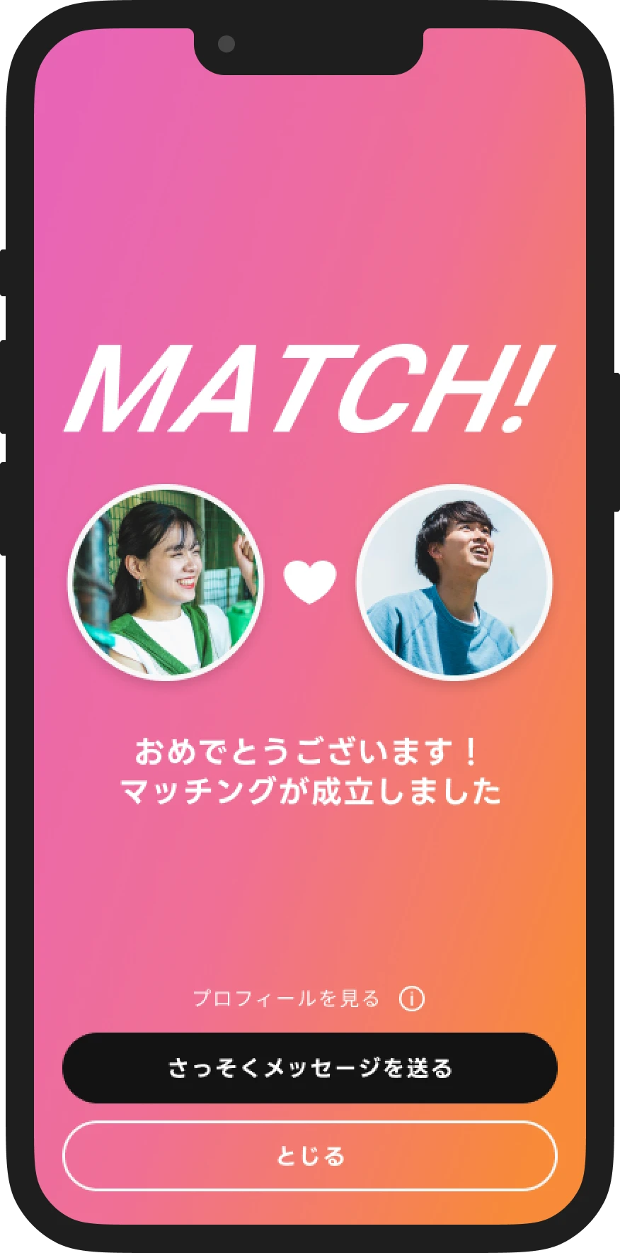 マッチング成立!気になるお相手を見つけたら、まずは「いいね」を送ってアプローチ。