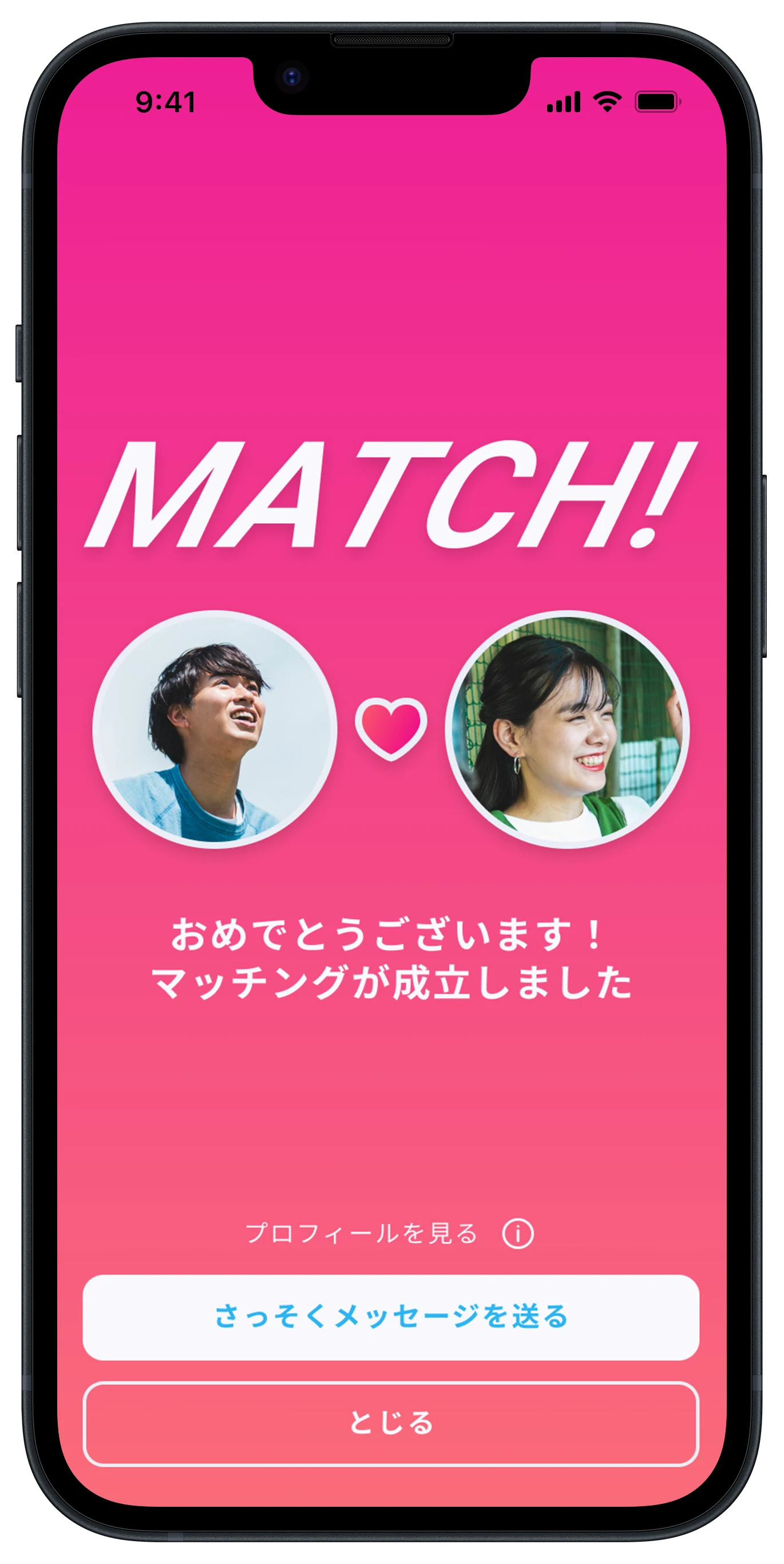 気になる方には「いいね」を送って、お相手からも「いいね」が返ってきたらマッチング❤️マッチングした人とだけ、メッセージのやり取りができるようになります。
