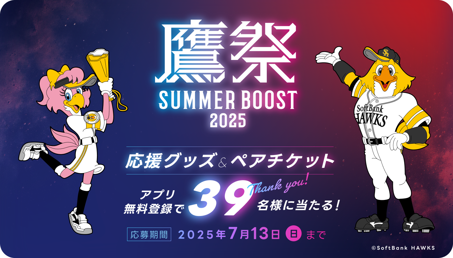 ドームを飛び出し、福岡のまちへ。野球の枠を超えた「鷹祭 SUMMER BOOST」。今年の夏も、このまちがエンタメ色に染まっていく。ホークスファンも、福岡のみんなも、興奮と刺激に満ちた時間をいっしょに楽しもう。福岡の夏を、ブーストしようぜ!